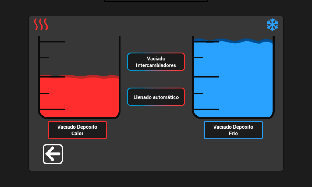 El llenado y vaciado de los depósitos se realiza únicamente en el momento de la puesta en marcha del equipo nuevo o durante su traslado, ya que, por razones de seguridad, el transporte debe efectuarse con los depósitos vacíos. El fluido utilizado es suministrado directamente por el fabricante, garantizando la compatibilidad y el correcto funcionamiento del sistema.