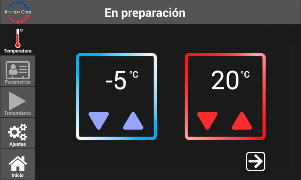 En esta fase del proceso se regula la temperatura de los fluidos térmicos que se aplicarán durante el proceso. El sistema permite ajustar el fluido caliente en un rango de 20 a 45 °C y el fluido frío entre -5 y 20 °C, garantizando un control preciso y adaptado a las necesidades del procedimiento.